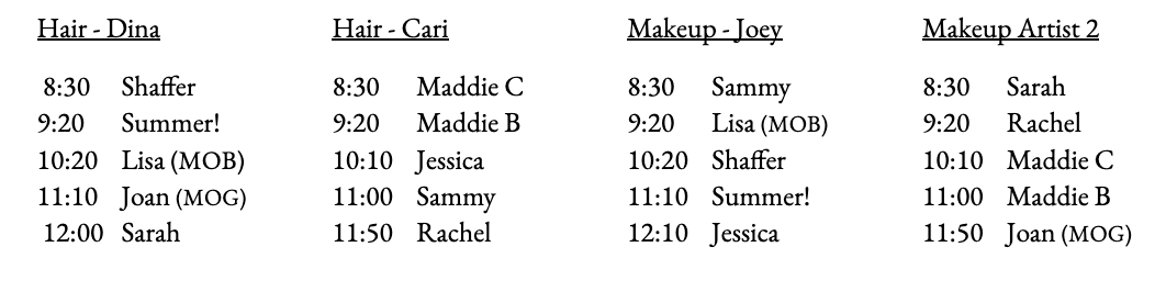 HAIR & MAKEUP SCHEDULE