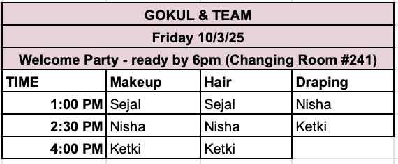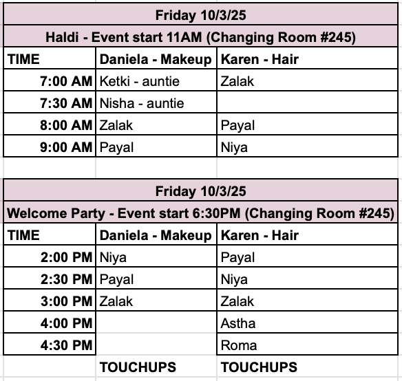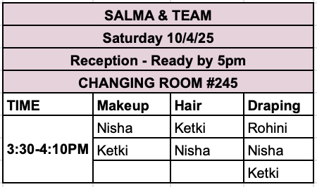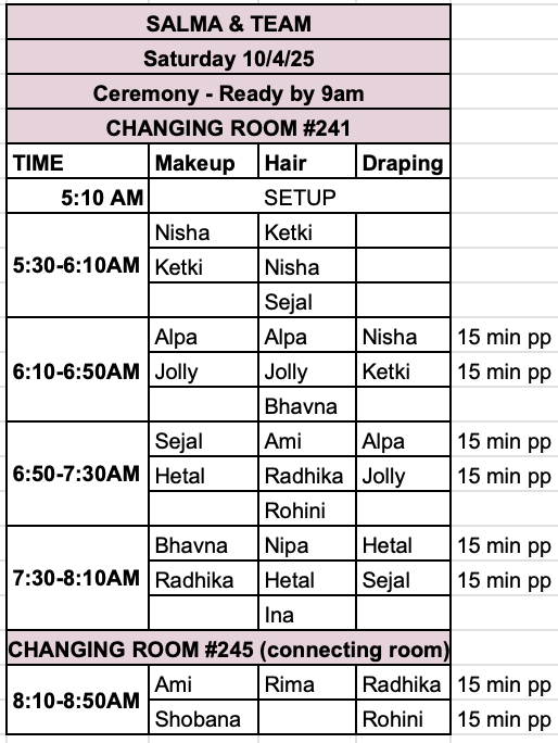 | 3:20am | Hair & makeup begins (please see ALL beauty schedules at the bottom of this page) → Zalak, Amy & Niya’s services are done in the bridal suite, ALL other services are done in the changing room #245 | |
